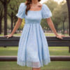 Mesh Embroidered Puff Sleeve Waist-tight Skirt Dress